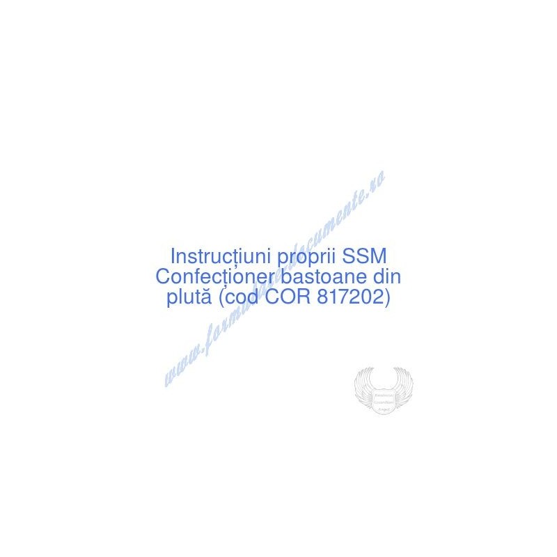 Aceste documente OBLIGATORII pentru ocupantul postului de Confecţioner bastoane din plută (cod COR 817202), sunt complet întocmite, respectând cerințele Codului muncii actualizat 2023, Legii securității și sănătății în muncă nr. 319/2006 (actualizată 2023), H.G. 1425/2006 (actualizată 2023) și răspund tuturor cerințelor standardelor de calitate referitoare la management (ISO 9001/ ISO 14001/ ISO 22000/ SR OHSAS 18001:2008/ ISO 45001:2018 etc.). Cuprinsul IPSSM pentru instruirea angajatului pe funcția de Confecţioner bastoane din plută :