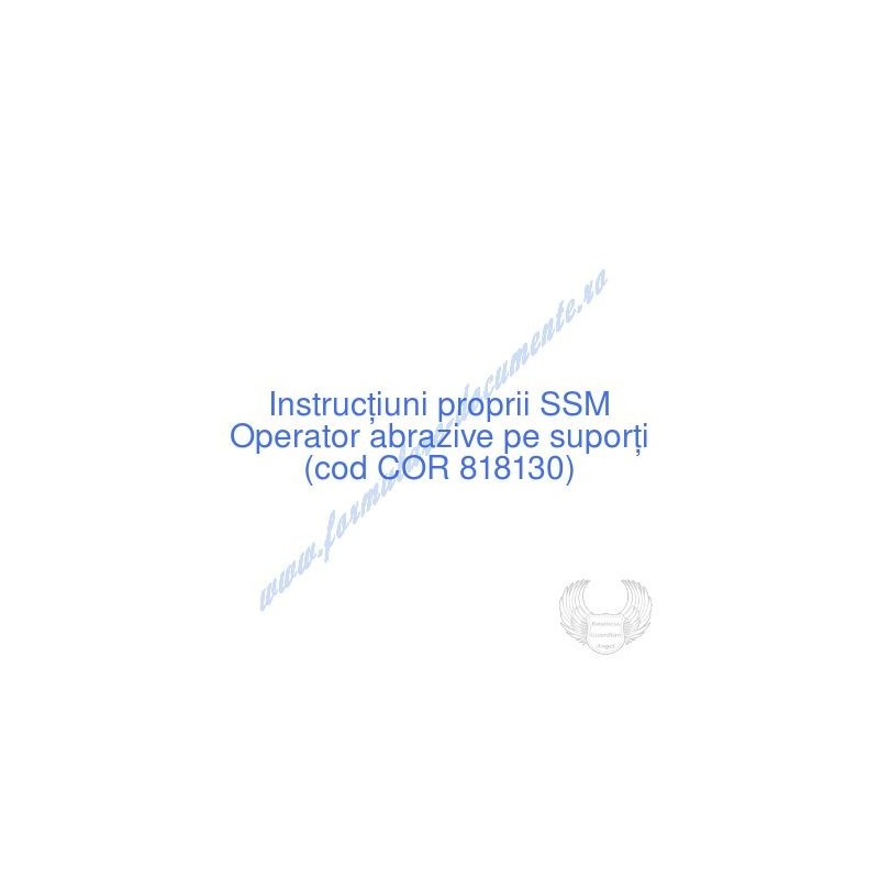 Aceste documente OBLIGATORII pentru ocupantul postului de Operator abrazive pe suporţi (cod COR 818130), sunt complet întocmite, respectând cerințele Codului muncii actualizat 2023, Legii securității și sănătății în muncă nr. 319/2006 (actualizată 2023), H.G. 1425/2006 (actualizată 2023) și răspund tuturor cerințelor standardelor de calitate referitoare la management (ISO 9001/ ISO 14001/ ISO 22000/ SR OHSAS 18001:2008/ ISO 45001:2018 etc.). Cuprinsul IPSSM pentru instruirea angajatului pe funcția de Operator abrazive pe suporţi :
