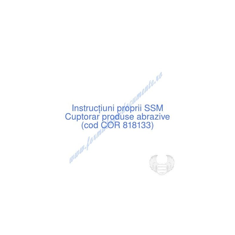 Aceste documente OBLIGATORII pentru ocupantul postului de Cuptorar produse abrazive (cod COR 818133), sunt complet întocmite, respectând cerințele Codului muncii actualizat 2023, Legii securității și sănătății în muncă nr. 319/2006 (actualizată 2023), H.G. 1425/2006 (actualizată 2023) și răspund tuturor cerințelor standardelor de calitate referitoare la management (ISO 9001/ ISO 14001/ ISO 22000/ SR OHSAS 18001:2008/ ISO 45001:2018 etc.). Cuprinsul IPSSM pentru instruirea angajatului pe funcția de Cuptorar produse abrazive :