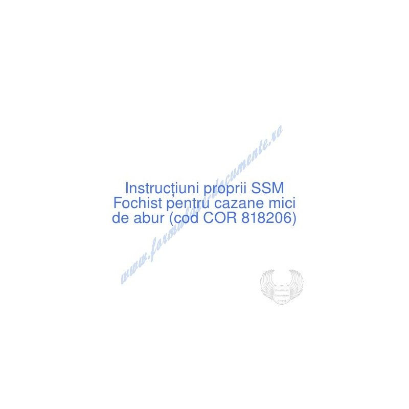 Aceste documente OBLIGATORII pentru ocupantul postului de Fochist pentru cazane mici de abur (cod COR 818206), sunt complet întocmite, respectând cerințele Codului muncii actualizat 2023, Legii securității și sănătății în muncă nr. 319/2006 (actualizată 2023), H.G. 1425/2006 (actualizată 2023) și răspund tuturor cerințelor standardelor de calitate referitoare la management (ISO 9001/ ISO 14001/ ISO 22000/ SR OHSAS 18001:2008/ ISO 45001:2018 etc.). Cuprinsul IPSSM pentru instruirea angajatului pe funcția de Fochist pentru cazane mici de abur :