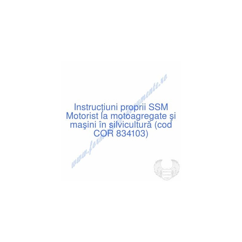 Aceste documente OBLIGATORII pentru ocupantul postului de Motorist la motoagregate şi maşini în silvicultură (cod COR 834103), sunt complet întocmite, respectând cerințele Codului muncii actualizat 2023, Legii securității și sănătății în muncă nr. 319/2006 (actualizată 2023), H.G. 1425/2006 (actualizată 2023) și răspund tuturor cerințelor standardelor de calitate referitoare la management (ISO 9001/ ISO 14001/ ISO 22000/ SR OHSAS 18001:2008/ ISO 45001:2018 etc.). Cuprinsul IPSSM pentru instruirea angajatului pe funcția de Motorist la motoagregate şi maşini în silvicultură :