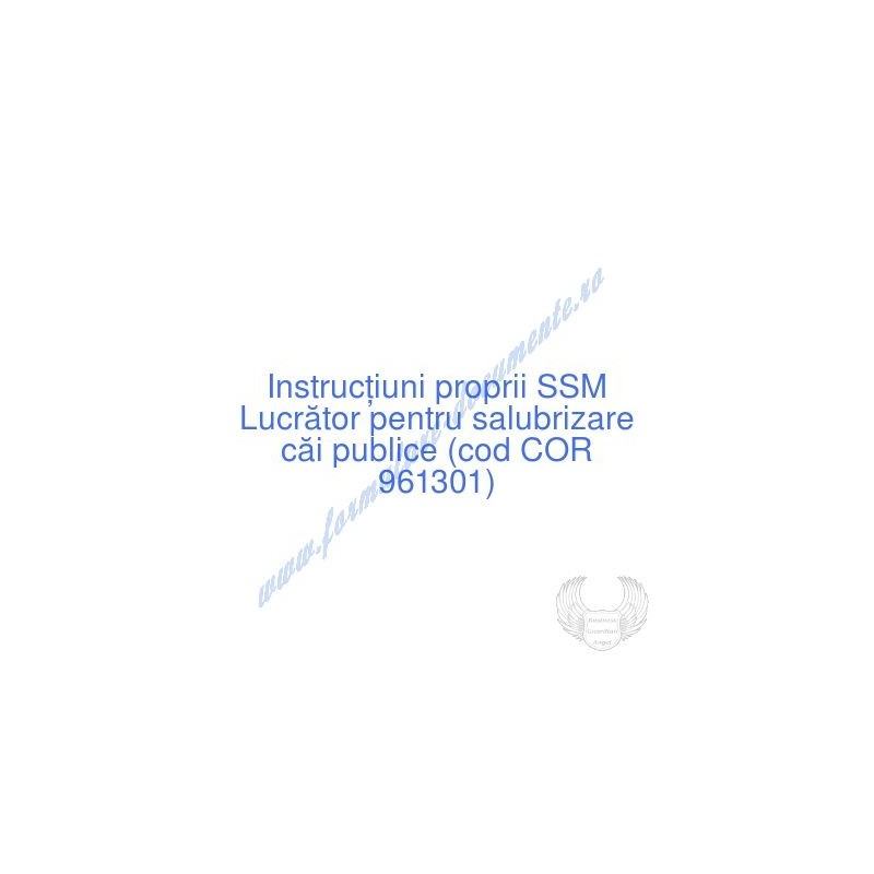 Aceste documente OBLIGATORII pentru ocupantul postului de Lucrător pentru salubrizare căi publice (cod COR 961301), sunt complet întocmite, respectând cerințele Codului muncii actualizat 2023, Legii securității și sănătății în muncă nr. 319/2006 (actualizată 2023), H.G. 1425/2006 (actualizată 2023) și răspund tuturor cerințelor standardelor de calitate referitoare la management (ISO 9001/ ISO 14001/ ISO 22000/ SR OHSAS 18001:2008/ ISO 45001:2018 etc.). Cuprinsul IPSSM pentru instruirea angajatului pe funcția de Lucrător pentru salubrizare căi publice :