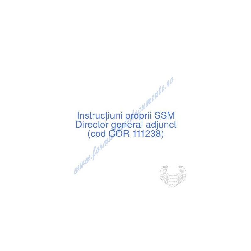 Aceste documente OBLIGATORII pentru ocupantul postului de Director general adjunct (cod COR 111238), sunt complet întocmite, respectând cerințele Codului muncii actualizat 2023, Legii securității și sănătății în muncă nr. 319/2006 (actualizată 2023), H.G. 1425/2006 (actualizată 2023) și răspund tuturor cerințelor standardelor de calitate referitoare la management (ISO 9001/ ISO 14001/ ISO 22000/ SR OHSAS 18001:2008/ ISO 45001:2018 etc.). Cuprinsul IPSSM pentru instruirea angajatului pe funcția de Director general adjunct :
