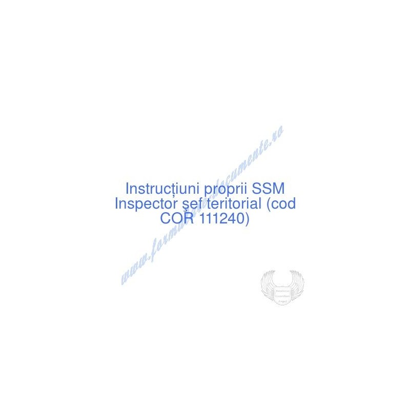 Aceste documente OBLIGATORII pentru ocupantul postului de Inspector şef teritorial (cod COR 111240), sunt complet întocmite, respectând cerințele Codului muncii actualizat 2023, Legii securității și sănătății în muncă nr. 319/2006 (actualizată 2023), H.G. 1425/2006 (actualizată 2023) și răspund tuturor cerințelor standardelor de calitate referitoare la management (ISO 9001/ ISO 14001/ ISO 22000/ SR OHSAS 18001:2008/ ISO 45001:2018 etc.). Cuprinsul IPSSM pentru instruirea angajatului pe funcția de Inspector şef teritorial :
