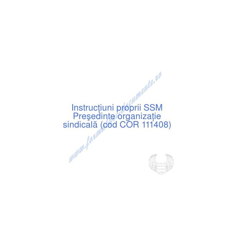 Aceste documente OBLIGATORII pentru ocupantul postului de Preşedinte organizaţie sindicală (cod COR 111408), sunt complet întocmite, respectând cerințele Codului muncii actualizat 2023, Legii securității și sănătății în muncă nr. 319/2006 (actualizată 2023), H.G. 1425/2006 (actualizată 2023) și răspund tuturor cerințelor standardelor de calitate referitoare la management (ISO 9001/ ISO 14001/ ISO 22000/ SR OHSAS 18001:2008/ ISO 45001:2018 etc.). Cuprinsul IPSSM pentru instruirea angajatului pe funcția de Preşedinte organizaţie sindicală :
