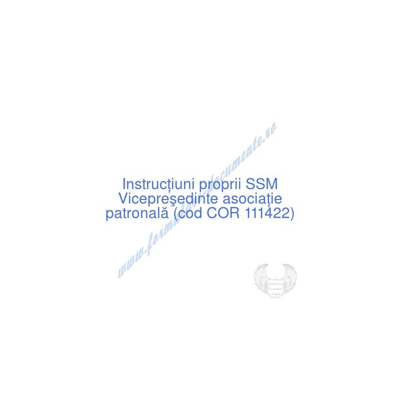Aceste documente OBLIGATORII pentru ocupantul postului de Vicepreşedinte asociaţie patronală (cod COR 111422), sunt complet întocmite, respectând cerințele Codului muncii actualizat 2023, Legii securității și sănătății în muncă nr. 319/2006 (actualizată 2023), H.G. 1425/2006 (actualizată 2023) și răspund tuturor cerințelor standardelor de calitate referitoare la management (ISO 9001/ ISO 14001/ ISO 22000/ SR OHSAS 18001:2008/ ISO 45001:2018 etc.). Cuprinsul IPSSM pentru instruirea angajatului pe funcția de Vicepreşedinte asociaţie patronală :