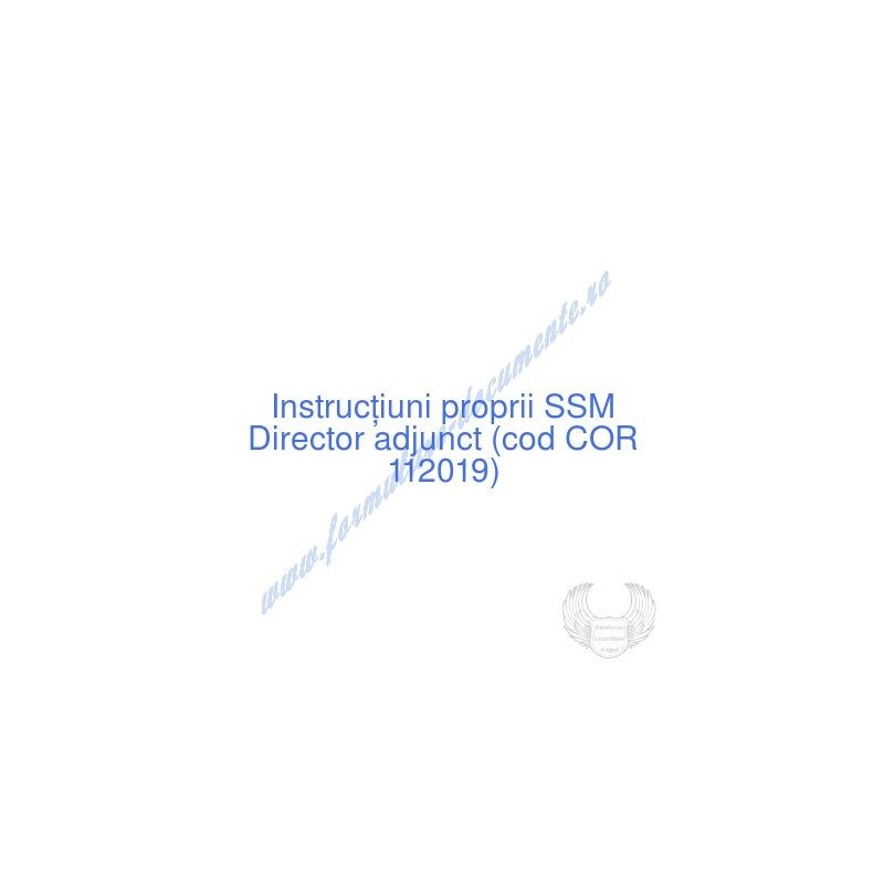 Aceste documente OBLIGATORII pentru ocupantul postului de Director adjunct (cod COR 112019), sunt complet întocmite, respectând cerințele Codului muncii actualizat 2023, Legii securității și sănătății în muncă nr. 319/2006 (actualizată 2023), H.G. 1425/2006 (actualizată 2023) și răspund tuturor cerințelor standardelor de calitate referitoare la management (ISO 9001/ ISO 14001/ ISO 22000/ SR OHSAS 18001:2008/ ISO 45001:2018 etc.). Cuprinsul IPSSM pentru instruirea angajatului pe funcția de Director adjunct :