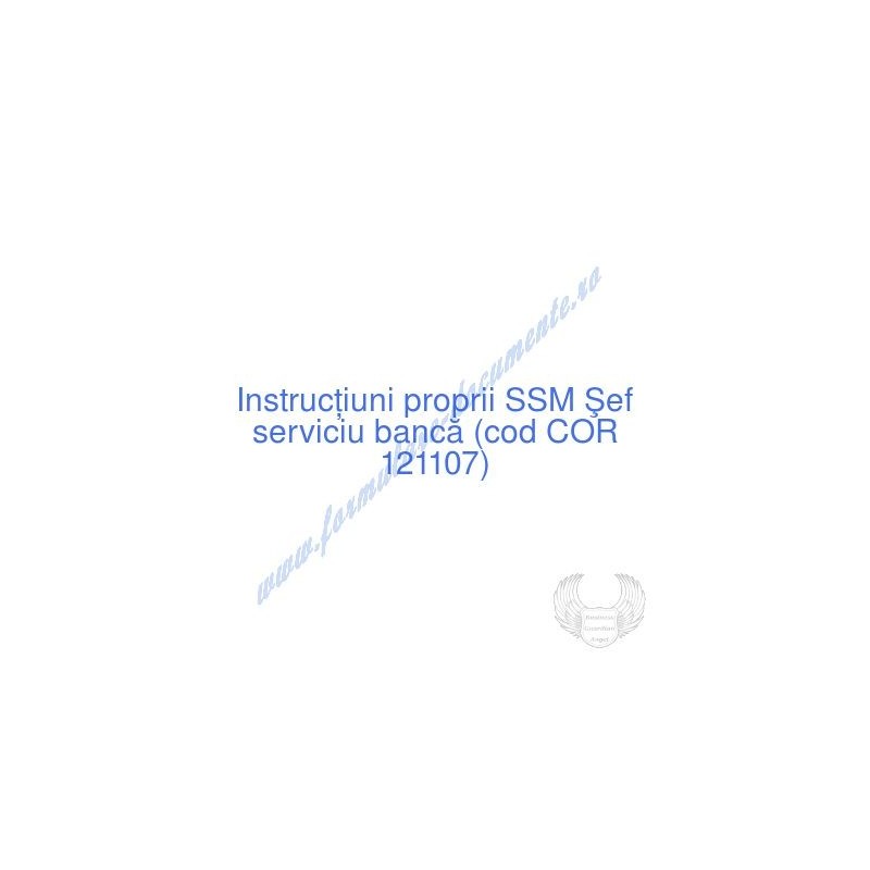 Aceste documente OBLIGATORII pentru ocupantul postului de Şef serviciu bancă (cod COR 121107), sunt complet întocmite, respectând cerințele Codului muncii actualizat 2023, Legii securității și sănătății în muncă nr. 319/2006 (actualizată 2023), H.G. 1425/2006 (actualizată 2023) și răspund tuturor cerințelor standardelor de calitate referitoare la management (ISO 9001/ ISO 14001/ ISO 22000/ SR OHSAS 18001:2008/ ISO 45001:2018 etc.). Cuprinsul IPSSM pentru instruirea angajatului pe funcția de Şef serviciu bancă :