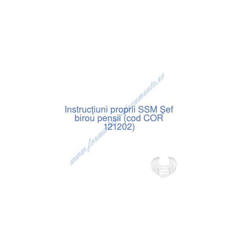 Aceste documente OBLIGATORII pentru ocupantul postului de Şef birou pensii (cod COR 121202), sunt complet întocmite, respectând cerințele Codului muncii actualizat 2023, Legii securității și sănătății în muncă nr. 319/2006 (actualizată 2023), H.G. 1425/2006 (actualizată 2023) și răspund tuturor cerințelor standardelor de calitate referitoare la management (ISO 9001/ ISO 14001/ ISO 22000/ SR OHSAS 18001:2008/ ISO 45001:2018 etc.). Cuprinsul IPSSM pentru instruirea angajatului pe funcția de Şef birou pensii :