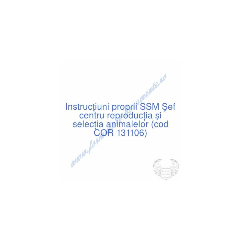 Aceste documente OBLIGATORII pentru ocupantul postului de Şef centru reproducţia şi selecţia animalelor (cod COR 131106), sunt complet întocmite, respectând cerințele Codului muncii actualizat 2023, Legii securității și sănătății în muncă nr. 319/2006 (actualizată 2023), H.G. 1425/2006 (actualizată 2023) și răspund tuturor cerințelor standardelor de calitate referitoare la management (ISO 9001/ ISO 14001/ ISO 22000/ SR OHSAS 18001:2008/ ISO 45001:2018 etc.). Cuprinsul IPSSM pentru instruirea angajatului pe funcția de Şef centru reproducţia şi selecţia animalelor :