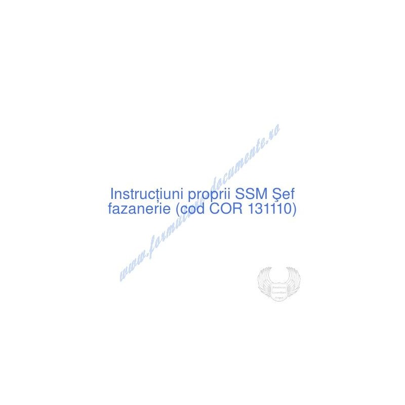 Aceste documente OBLIGATORII pentru ocupantul postului de Şef fazanerie (cod COR 131110), sunt complet întocmite, respectând cerințele Codului muncii actualizat 2023, Legii securității și sănătății în muncă nr. 319/2006 (actualizată 2023), H.G. 1425/2006 (actualizată 2023) și răspund tuturor cerințelor standardelor de calitate referitoare la management (ISO 9001/ ISO 14001/ ISO 22000/ SR OHSAS 18001:2008/ ISO 45001:2018 etc.). Cuprinsul IPSSM pentru instruirea angajatului pe funcția de Şef fazanerie :