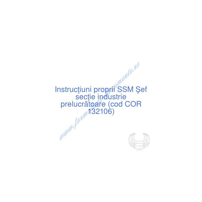 Aceste documente OBLIGATORII pentru ocupantul postului de Şef secţie industrie prelucrătoare (cod COR 132106), sunt complet întocmite, respectând cerințele Codului muncii actualizat 2023, Legii securității și sănătății în muncă nr. 319/2006 (actualizată 2023), H.G. 1425/2006 (actualizată 2023) și răspund tuturor cerințelor standardelor de calitate referitoare la management (ISO 9001/ ISO 14001/ ISO 22000/ SR OHSAS 18001:2008/ ISO 45001:2018 etc.). Cuprinsul IPSSM pentru instruirea angajatului pe funcția de Şef secţie industrie prelucrătoare :