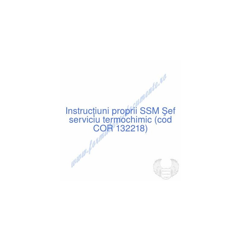 Aceste documente OBLIGATORII pentru ocupantul postului de Şef serviciu termochimic (cod COR 132218), sunt complet întocmite, respectând cerințele Codului muncii actualizat 2023, Legii securității și sănătății în muncă nr. 319/2006 (actualizată 2023), H.G. 1425/2006 (actualizată 2023) și răspund tuturor cerințelor standardelor de calitate referitoare la management (ISO 9001/ ISO 14001/ ISO 22000/ SR OHSAS 18001:2008/ ISO 45001:2018 etc.). Cuprinsul IPSSM pentru instruirea angajatului pe funcția de Şef serviciu termochimic :