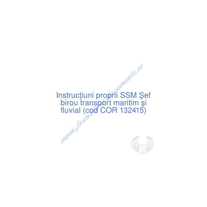 Aceste documente OBLIGATORII pentru ocupantul postului de Şef birou transport maritim şi fluvial (cod COR 132415), sunt complet întocmite, respectând cerințele Codului muncii actualizat 2023, Legii securității și sănătății în muncă nr. 319/2006 (actualizată 2023), H.G. 1425/2006 (actualizată 2023) și răspund tuturor cerințelor standardelor de calitate referitoare la management (ISO 9001/ ISO 14001/ ISO 22000/ SR OHSAS 18001:2008/ ISO 45001:2018 etc.). Cuprinsul IPSSM pentru instruirea angajatului pe funcția de Şef birou transport maritim şi fluvial :
