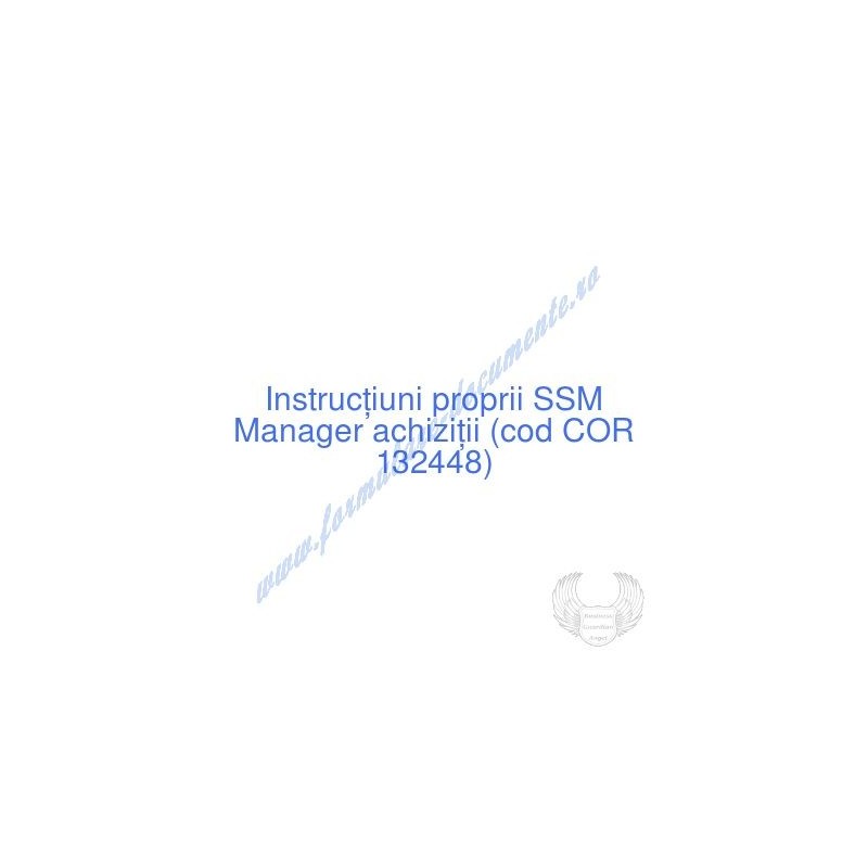 Aceste documente OBLIGATORII pentru ocupantul postului de Manager achiziţii (cod COR 132448), sunt complet întocmite, respectând cerințele Codului muncii actualizat 2023, Legii securității și sănătății în muncă nr. 319/2006 (actualizată 2023), H.G. 1425/2006 (actualizată 2023) și răspund tuturor cerințelor standardelor de calitate referitoare la management (ISO 9001/ ISO 14001/ ISO 22000/ SR OHSAS 18001:2008/ ISO 45001:2018 etc.). Cuprinsul IPSSM pentru instruirea angajatului pe funcția de Manager achiziţii :