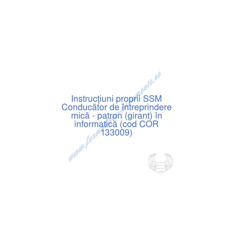 Aceste documente OBLIGATORII pentru ocupantul postului de Conducător de întreprindere mică - patron (girant) în informatică (cod COR 133009), sunt complet întocmite, respectând cerințele Codului muncii actualizat 2023, Legii securității și sănătății în muncă nr. 319/2006 (actualizată 2023), H.G. 1425/2006 (actualizată 2023) și răspund tuturor cerințelor standardelor de calitate referitoare la management (ISO 9001/ ISO 14001/ ISO 22000/ SR OHSAS 18001:2008/ ISO 45001:2018 etc.). Cuprinsul IPSSM pentru instruirea angajatului pe funcția de Conducător de întreprindere mică - patron (girant) în informatică :