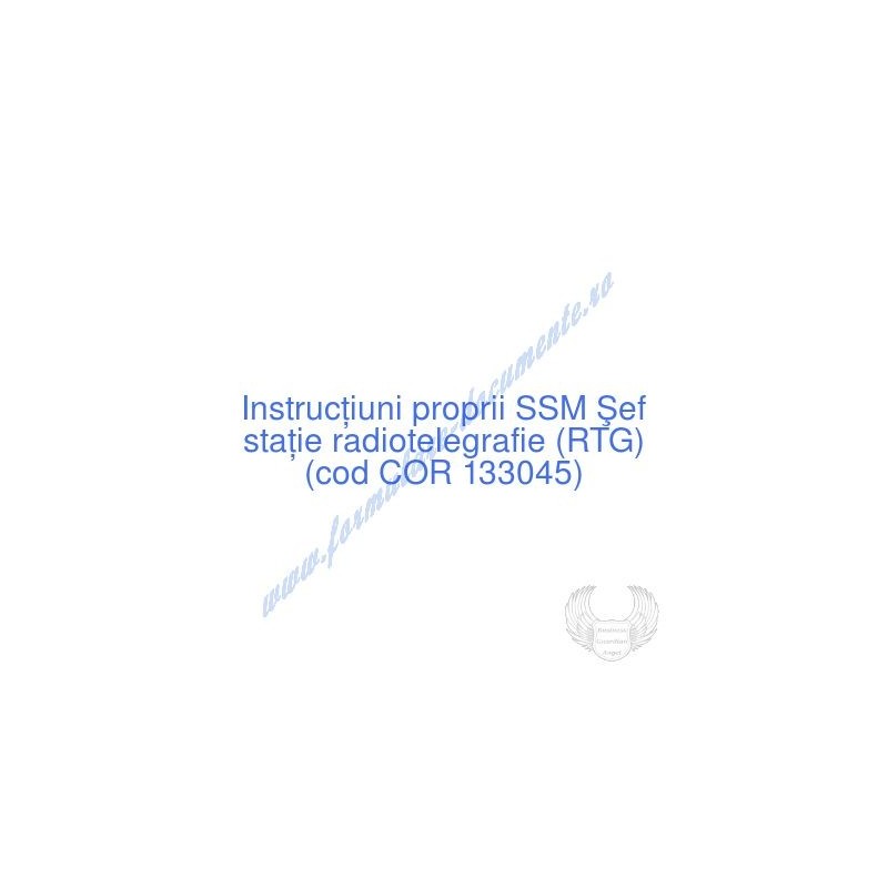 Aceste documente OBLIGATORII pentru ocupantul postului de Şef staţie radiotelegrafie (RTG) (cod COR 133045), sunt complet întocmite, respectând cerințele Codului muncii actualizat 2023, Legii securității și sănătății în muncă nr. 319/2006 (actualizată 2023), H.G. 1425/2006 (actualizată 2023) și răspund tuturor cerințelor standardelor de calitate referitoare la management (ISO 9001/ ISO 14001/ ISO 22000/ SR OHSAS 18001:2008/ ISO 45001:2018 etc.). Cuprinsul IPSSM pentru instruirea angajatului pe funcția de Şef staţie radiotelegrafie (RTG) :