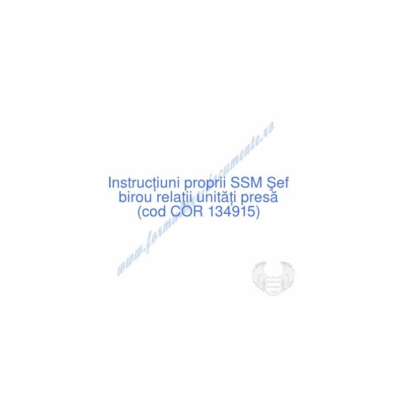 Aceste documente OBLIGATORII pentru ocupantul postului de Şef birou relaţii unităţi presă (cod COR 134915), sunt complet întocmite, respectând cerințele Codului muncii actualizat 2023, Legii securității și sănătății în muncă nr. 319/2006 (actualizată 2023), H.G. 1425/2006 (actualizată 2023) și răspund tuturor cerințelor standardelor de calitate referitoare la management (ISO 9001/ ISO 14001/ ISO 22000/ SR OHSAS 18001:2008/ ISO 45001:2018 etc.). Cuprinsul IPSSM pentru instruirea angajatului pe funcția de Şef birou relaţii unităţi presă :