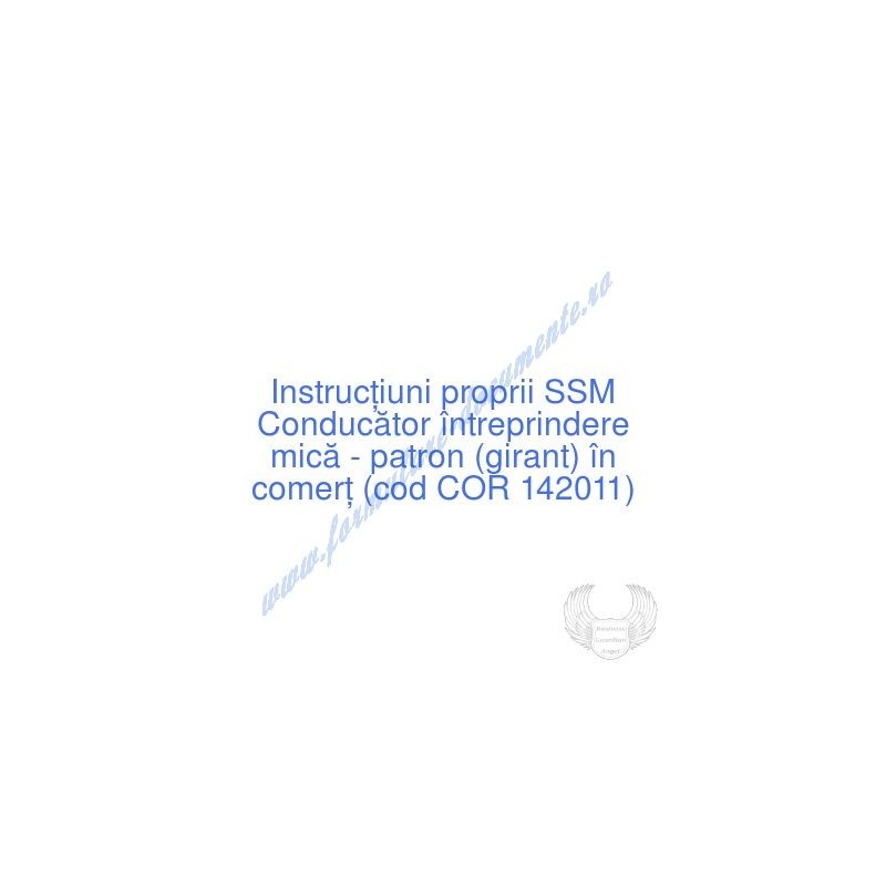 Aceste documente OBLIGATORII pentru ocupantul postului de Conducător întreprindere mică - patron (girant) în comerţ (cod COR 142011), sunt complet întocmite, respectând cerințele Codului muncii actualizat 2023, Legii securității și sănătății în muncă nr. 319/2006 (actualizată 2023), H.G. 1425/2006 (actualizată 2023) și răspund tuturor cerințelor standardelor de calitate referitoare la management (ISO 9001/ ISO 14001/ ISO 22000/ SR OHSAS 18001:2008/ ISO 45001:2018 etc.). Cuprinsul IPSSM pentru instruirea angajatului pe funcția de Conducător întreprindere mică - patron (girant) în comerţ :