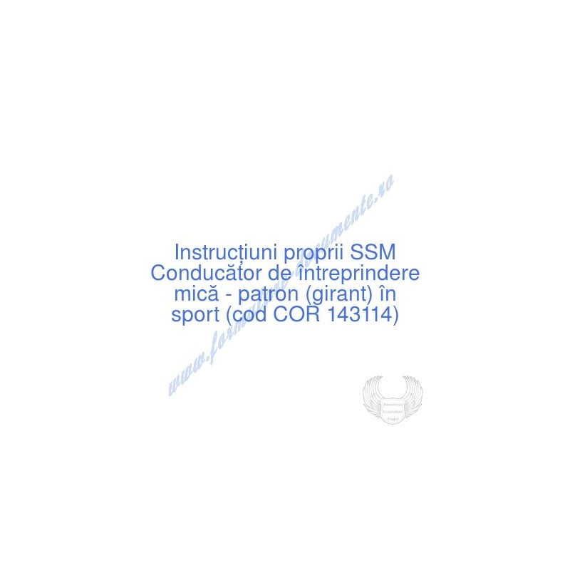 Aceste documente OBLIGATORII pentru ocupantul postului de Conducător de întreprindere mică - patron (girant) în sport (cod COR 143114), sunt complet întocmite, respectând cerințele Codului muncii actualizat 2023, Legii securității și sănătății în muncă nr. 319/2006 (actualizată 2023), H.G. 1425/2006 (actualizată 2023) și răspund tuturor cerințelor standardelor de calitate referitoare la management (ISO 9001/ ISO 14001/ ISO 22000/ SR OHSAS 18001:2008/ ISO 45001:2018 etc.). Cuprinsul IPSSM pentru instruirea angajatului pe funcția de Conducător de întreprindere mică - patron (girant) în sport :