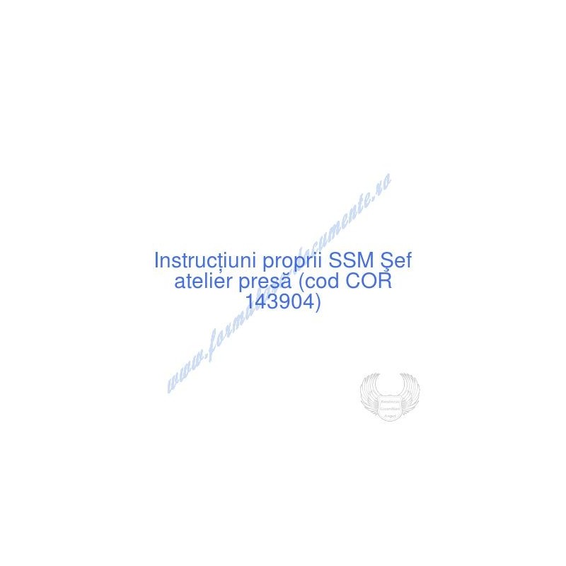 Aceste documente OBLIGATORII pentru ocupantul postului de Şef atelier presă (cod COR 143904), sunt complet întocmite, respectând cerințele Codului muncii actualizat 2023, Legii securității și sănătății în muncă nr. 319/2006 (actualizată 2023), H.G. 1425/2006 (actualizată 2023) și răspund tuturor cerințelor standardelor de calitate referitoare la management (ISO 9001/ ISO 14001/ ISO 22000/ SR OHSAS 18001:2008/ ISO 45001:2018 etc.). Cuprinsul IPSSM pentru instruirea angajatului pe funcția de Şef atelier presă :