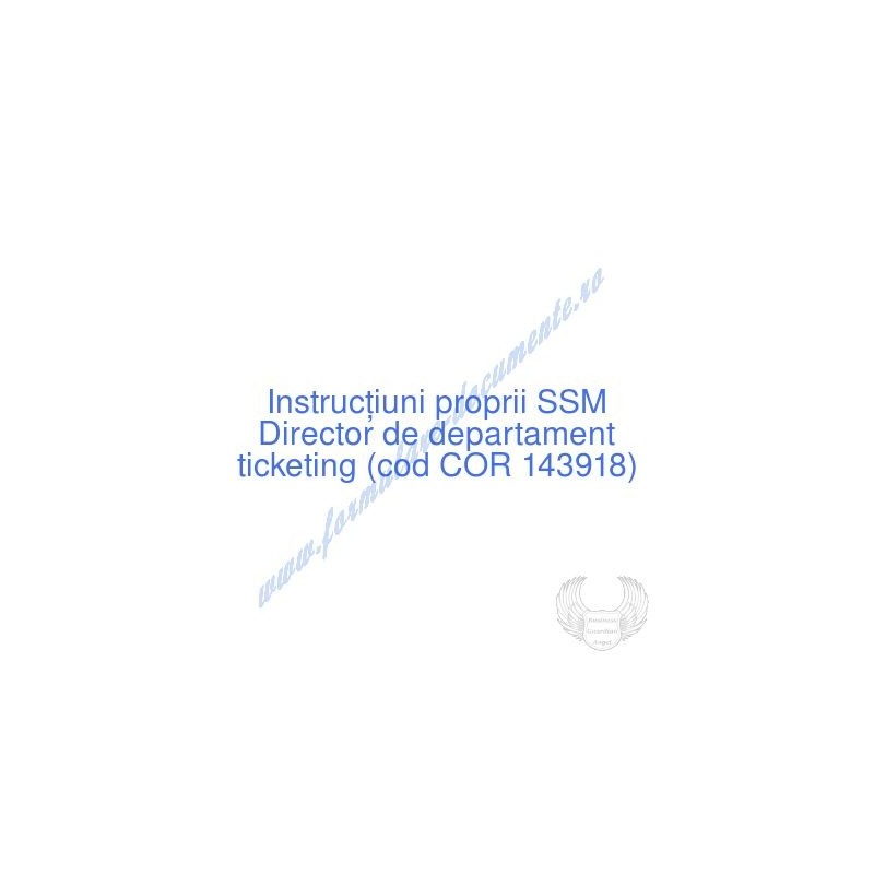 Aceste documente OBLIGATORII pentru ocupantul postului de Director de departament ticketing (cod COR 143918), sunt complet întocmite, respectând cerințele Codului muncii actualizat 2023, Legii securității și sănătății în muncă nr. 319/2006 (actualizată 2023), H.G. 1425/2006 (actualizată 2023) și răspund tuturor cerințelor standardelor de calitate referitoare la management (ISO 9001/ ISO 14001/ ISO 22000/ SR OHSAS 18001:2008/ ISO 45001:2018 etc.). Cuprinsul IPSSM pentru instruirea angajatului pe funcția de Director de departament ticketing :