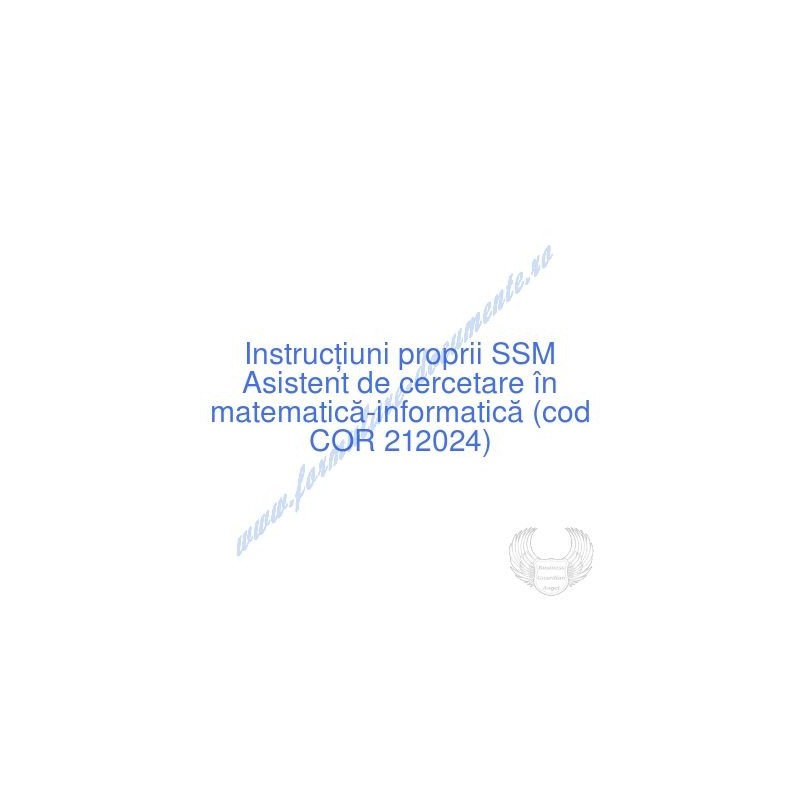 Aceste documente OBLIGATORII pentru ocupantul postului de Asistent de cercetare în matematică-informatică (cod COR 212024), sunt complet întocmite, respectând cerințele Codului muncii actualizat 2023, Legii securității și sănătății în muncă nr. 319/2006 (actualizată 2023), H.G. 1425/2006 (actualizată 2023) și răspund tuturor cerințelor standardelor de calitate referitoare la management (ISO 9001/ ISO 14001/ ISO 22000/ SR OHSAS 18001:2008/ ISO 45001:2018 etc.). Cuprinsul IPSSM pentru instruirea angajatului pe funcția de Asistent de cercetare în matematică-informatică :