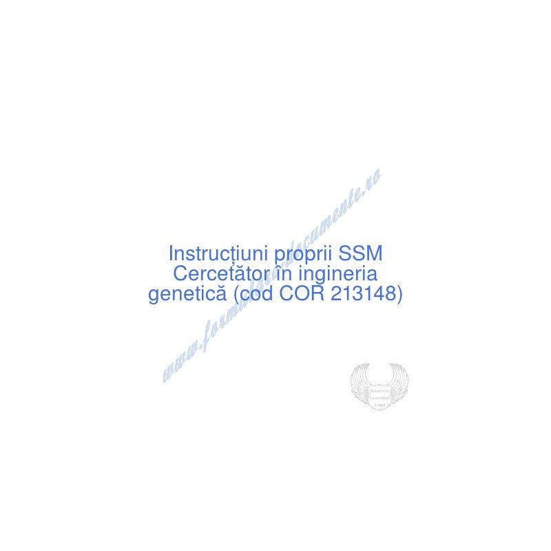 Aceste documente OBLIGATORII pentru ocupantul postului de Cercetător în ingineria genetică (cod COR 213148), sunt complet întocmite, respectând cerințele Codului muncii actualizat 2023, Legii securității și sănătății în muncă nr. 319/2006 (actualizată 2023), H.G. 1425/2006 (actualizată 2023) și răspund tuturor cerințelor standardelor de calitate referitoare la management (ISO 9001/ ISO 14001/ ISO 22000/ SR OHSAS 18001:2008/ ISO 45001:2018 etc.). Cuprinsul IPSSM pentru instruirea angajatului pe funcția de Cercetător în ingineria genetică :