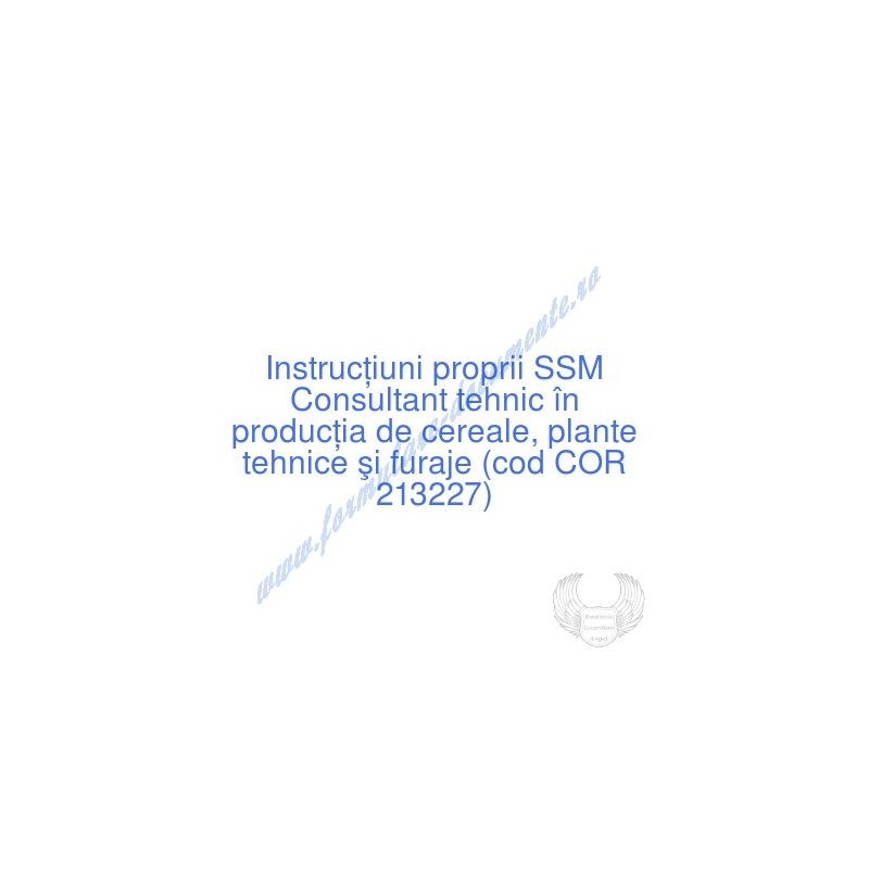 Aceste documente OBLIGATORII pentru ocupantul postului de Consultant tehnic în producţia de cereale, plante tehnice şi furaje (cod COR 213227), sunt complet întocmite, respectând cerințele Codului muncii actualizat 2023, Legii securității și sănătății în muncă nr. 319/2006 (actualizată 2023), H.G. 1425/2006 (actualizată 2023) și răspund tuturor cerințelor standardelor de calitate referitoare la management (ISO 9001/ ISO 14001/ ISO 22000/ SR OHSAS 18001:2008/ ISO 45001:2018 etc.). Cuprinsul IPSSM pentru instruirea angajatului pe funcția de Consultant tehnic în producţia de cereale, plante tehnice şi furaje :