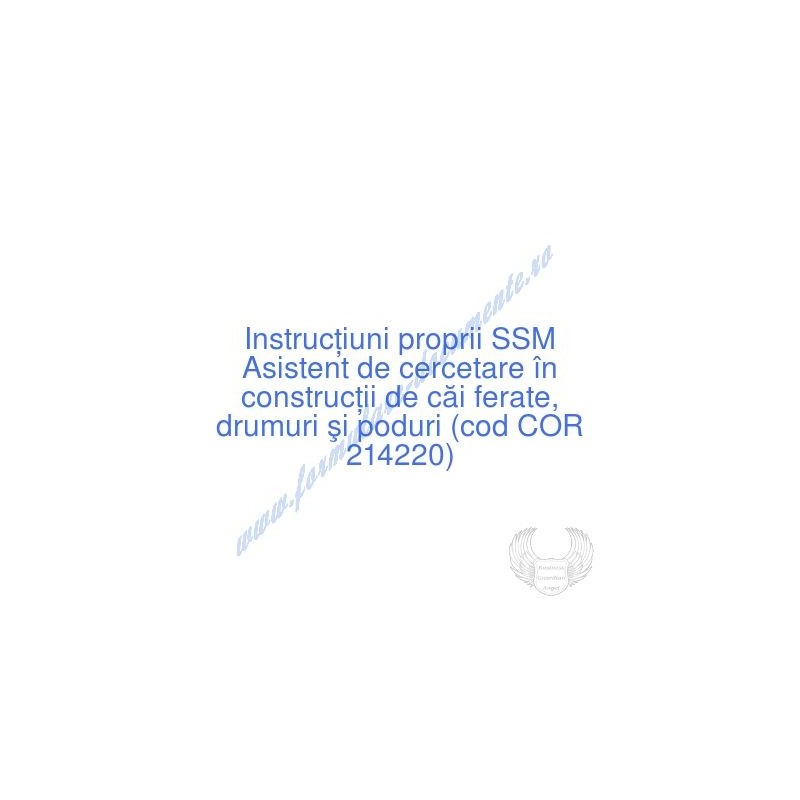Aceste documente OBLIGATORII pentru ocupantul postului de Asistent de cercetare în construcţii de căi ferate, drumuri şi poduri (cod COR 214220), sunt complet întocmite, respectând cerințele Codului muncii actualizat 2023, Legii securității și sănătății în muncă nr. 319/2006 (actualizată 2023), H.G. 1425/2006 (actualizată 2023) și răspund tuturor cerințelor standardelor de calitate referitoare la management (ISO 9001/ ISO 14001/ ISO 22000/ SR OHSAS 18001:2008/ ISO 45001:2018 etc.). Cuprinsul IPSSM pentru instruirea angajatului pe funcția de Asistent de cercetare în construcţii de căi ferate, drumuri şi poduri :