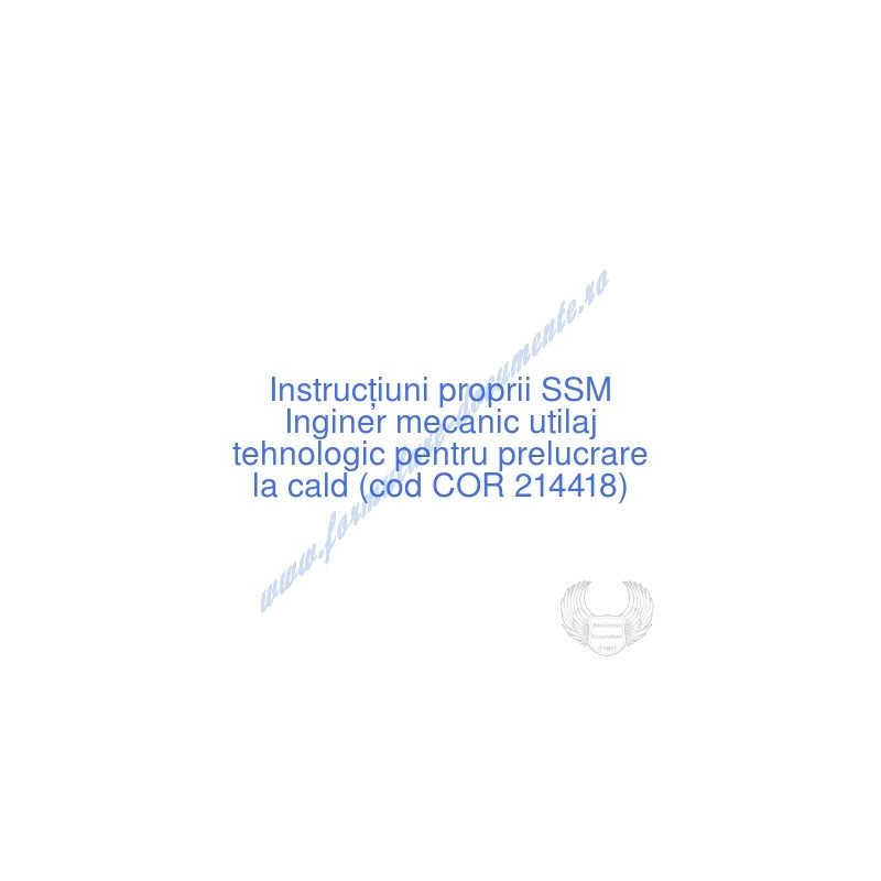 Aceste documente OBLIGATORII pentru ocupantul postului de Inginer mecanic utilaj tehnologic pentru prelucrare la cald (cod COR 214418), sunt complet întocmite, respectând cerințele Codului muncii actualizat 2023, Legii securității și sănătății în muncă nr. 319/2006 (actualizată 2023), H.G. 1425/2006 (actualizată 2023) și răspund tuturor cerințelor standardelor de calitate referitoare la management (ISO 9001/ ISO 14001/ ISO 22000/ SR OHSAS 18001:2008/ ISO 45001:2018 etc.). Cuprinsul IPSSM pentru instruirea angajatului pe funcția de Inginer mecanic utilaj tehnologic pentru prelucrare la cald :