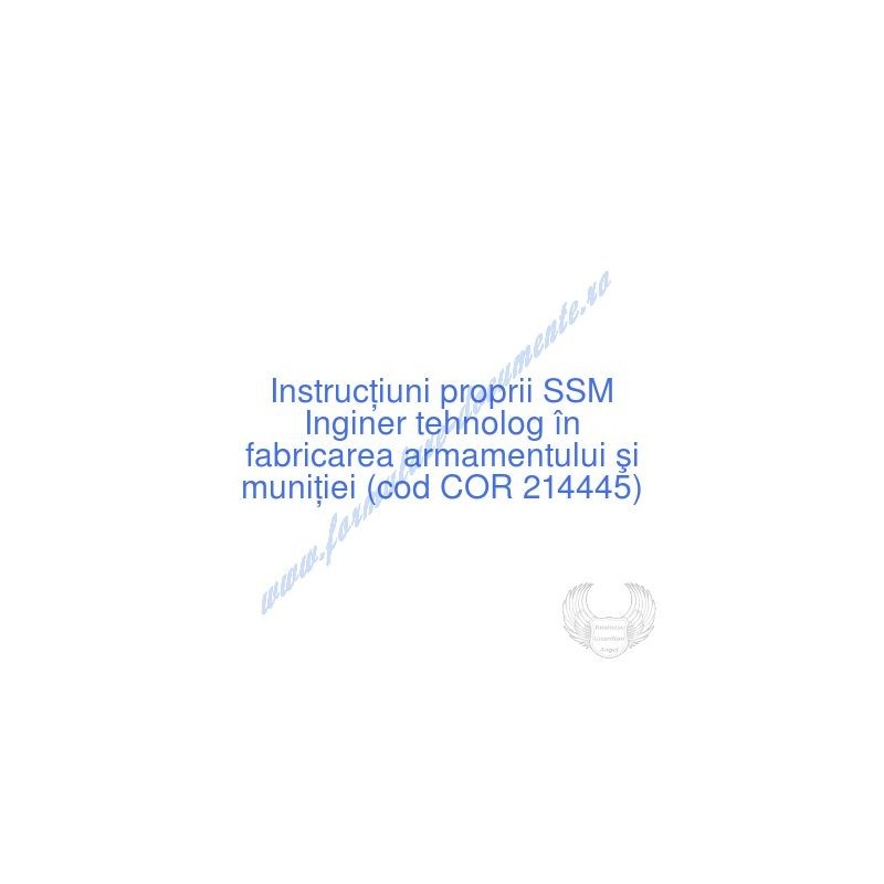 Aceste documente OBLIGATORII pentru ocupantul postului de Inginer tehnolog în fabricarea armamentului şi muniţiei (cod COR 214445), sunt complet întocmite, respectând cerințele Codului muncii actualizat 2023, Legii securității și sănătății în muncă nr. 319/2006 (actualizată 2023), H.G. 1425/2006 (actualizată 2023) și răspund tuturor cerințelor standardelor de calitate referitoare la management (ISO 9001/ ISO 14001/ ISO 22000/ SR OHSAS 18001:2008/ ISO 45001:2018 etc.). Cuprinsul IPSSM pentru instruirea angajatului pe funcția de Inginer tehnolog în fabricarea armamentului şi muniţiei :