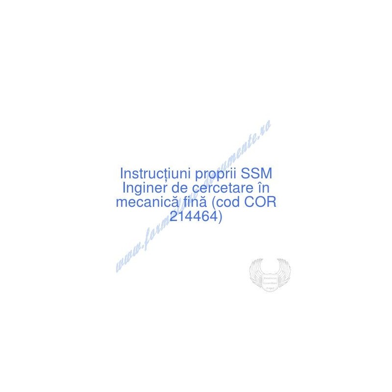Aceste documente OBLIGATORII pentru ocupantul postului de Inginer de cercetare în mecanică fină (cod COR 214464), sunt complet întocmite, respectând cerințele Codului muncii actualizat 2023, Legii securității și sănătății în muncă nr. 319/2006 (actualizată 2023), H.G. 1425/2006 (actualizată 2023) și răspund tuturor cerințelor standardelor de calitate referitoare la management (ISO 9001/ ISO 14001/ ISO 22000/ SR OHSAS 18001:2008/ ISO 45001:2018 etc.). Cuprinsul IPSSM pentru instruirea angajatului pe funcția de Inginer de cercetare în mecanică fină :
