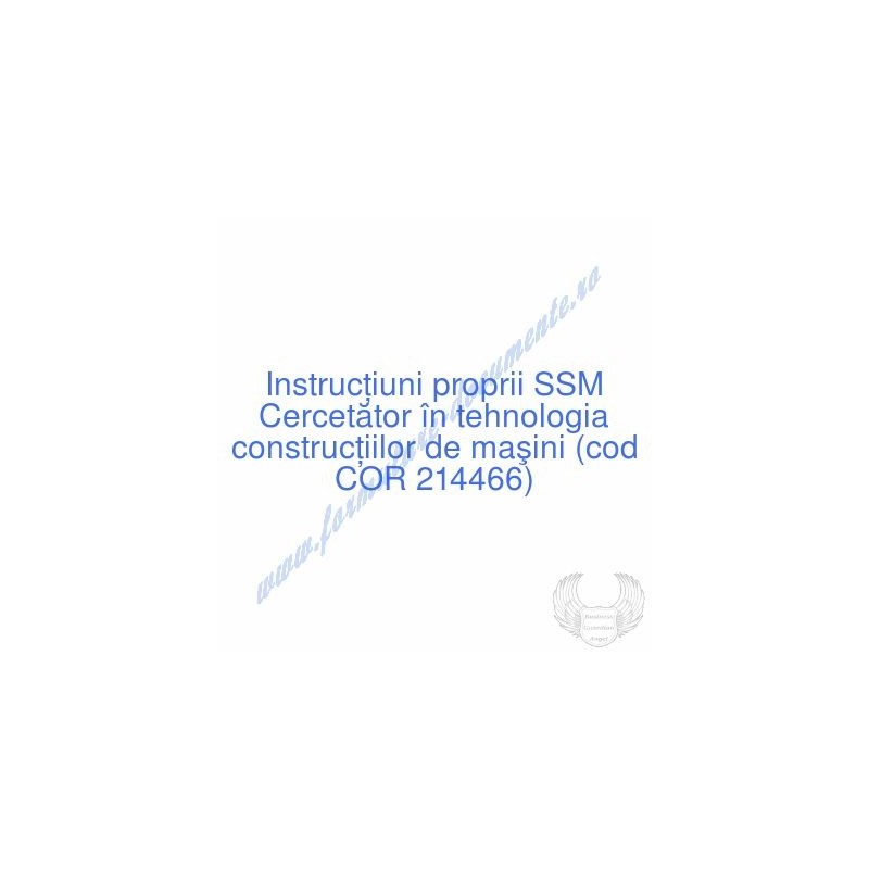 Aceste documente OBLIGATORII pentru ocupantul postului de Cercetător în tehnologia construcţiilor de maşini (cod COR 214466), sunt complet întocmite, respectând cerințele Codului muncii actualizat 2023, Legii securității și sănătății în muncă nr. 319/2006 (actualizată 2023), H.G. 1425/2006 (actualizată 2023) și răspund tuturor cerințelor standardelor de calitate referitoare la management (ISO 9001/ ISO 14001/ ISO 22000/ SR OHSAS 18001:2008/ ISO 45001:2018 etc.). Cuprinsul IPSSM pentru instruirea angajatului pe funcția de Cercetător în tehnologia construcţiilor de maşini :