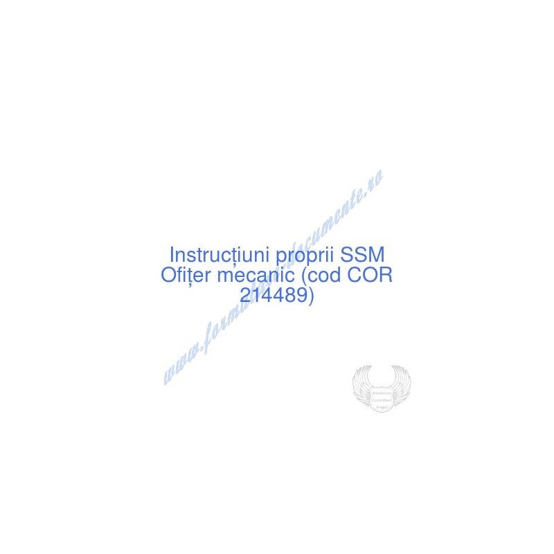 Aceste documente OBLIGATORII pentru ocupantul postului de Ofițer mecanic (cod COR 214489), sunt complet întocmite, respectând cerințele Codului muncii actualizat 2023, Legii securității și sănătății în muncă nr. 319/2006 (actualizată 2023), H.G. 1425/2006 (actualizată 2023) și răspund tuturor cerințelor standardelor de calitate referitoare la management (ISO 9001/ ISO 14001/ ISO 22000/ SR OHSAS 18001:2008/ ISO 45001:2018 etc.). Cuprinsul IPSSM pentru instruirea angajatului pe funcția de Ofițer mecanic :