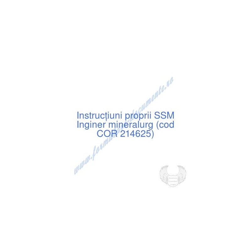 Aceste documente OBLIGATORII pentru ocupantul postului de Inginer mineralurg (cod COR 214625), sunt complet întocmite, respectând cerințele Codului muncii actualizat 2023, Legii securității și sănătății în muncă nr. 319/2006 (actualizată 2023), H.G. 1425/2006 (actualizată 2023) și răspund tuturor cerințelor standardelor de calitate referitoare la management (ISO 9001/ ISO 14001/ ISO 22000/ SR OHSAS 18001:2008/ ISO 45001:2018 etc.). Cuprinsul IPSSM pentru instruirea angajatului pe funcția de Inginer mineralurg :